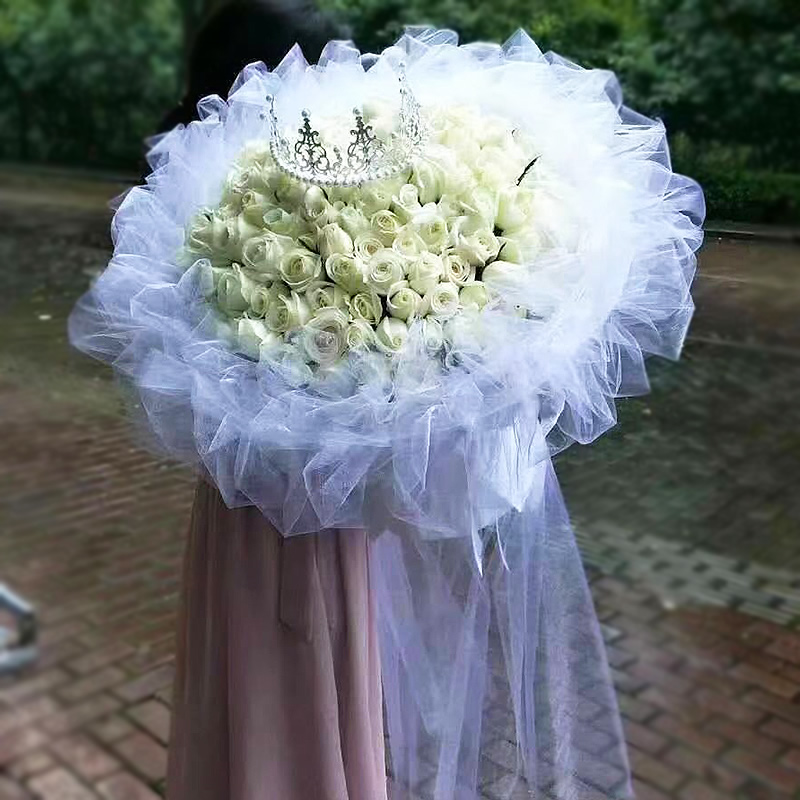 材料包裝: 99支白玫瑰,皇冠一個,白色網紗包裝.