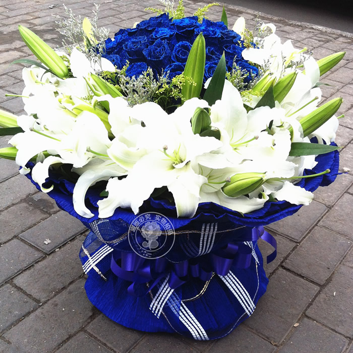 商品簡介:19朵藍色妖姬+18朵百合,百合朵包含花苞,藍色手揉紙,花束高約40-50CM,直徑約50CM 花束為手工花藝,因花材開放程度會有些差異,大小以實物為準!
