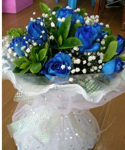 材料包裝: 【寶貝主材】:花束,11朵藍(lán)玫瑰,點(diǎn)綴綠葉、滿天星。 卷邊紙圓形精美包裝,配蝴蝶結(jié)束扎。