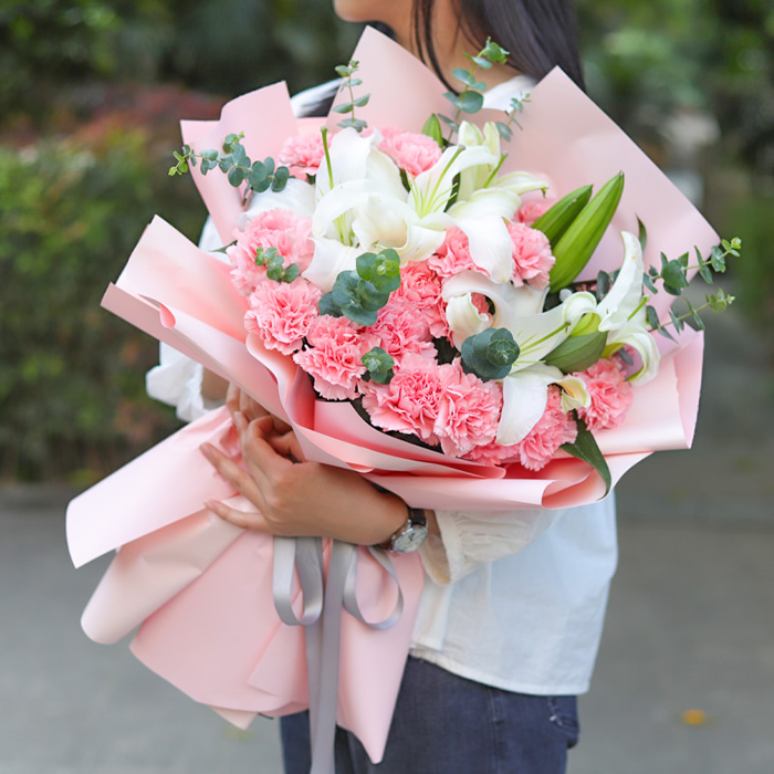 材料包裝: 粉色康乃馨19枝,多頭百合2只,尤加利點綴,粉色包裝.
