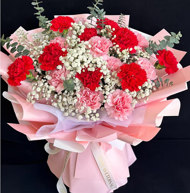 商品簡介:9朵康乃馨,10朵康乃馨,滿天星,尤加麗葉點綴,三層高檔包裝。