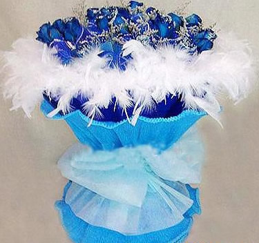 商品簡介:33支藍色妖姬 加白色羽毛圍邊搭配,藍色高檔卷邊紙包裝,細紗蝴蝶結