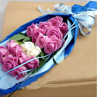 商品簡(jiǎn)介:15支紫玫瑰兩支香檳 天藍(lán)色高檔皺紋紙扇形包裝