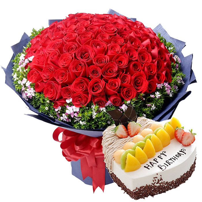 材料包裝: 99支精品紅玫瑰,搭配適量相思梅。2磅(8寸)奶油水果巧克力“愛心形”蛋糕,表面時令水果巧克力裝飾。包裝:深藍色硬紙包裝,精美紅色緞帶蝴蝶結束扎。