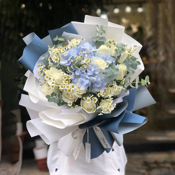 商品簡介:材料19朵白玫瑰+1支藍繡球,適量尤加利葉、小菊花裝飾。包裝白色手揉紙+白色硬紙+淺藍色硬紙包裝,白色英文緞帶束扎。
