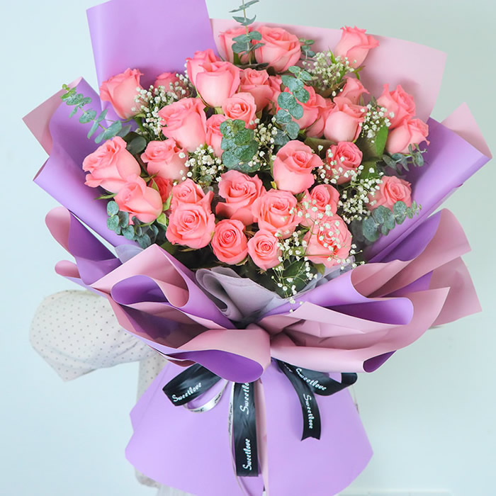材料包裝: 材料:33朵精品粉色戴安娜玫瑰,搭配適量滿天星、尤加利葉裝飾。包裝:浪漫紫色雙面歐雅紙圓形精美包裝,黑色英文緞帶蝴蝶結束扎。