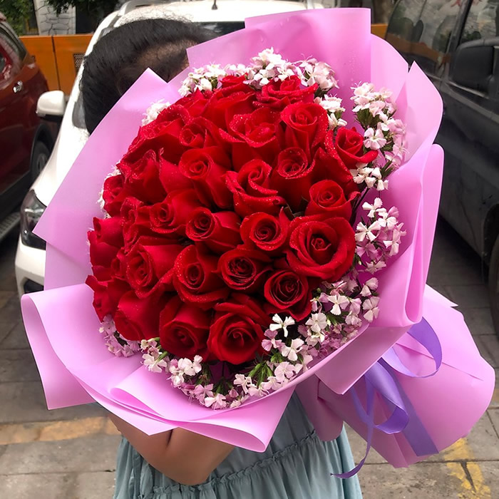 材料包裝: 材料:33朵精品紅玫瑰,搭配適量石竹梅圍邊。包裝:桃紅色花束紙包裝,紫色緞帶束扎。