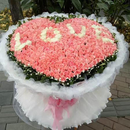 材料包裝: 粉玫瑰,白玫瑰999支,白玫瑰擺LOVE造型,滿天星綠葉搭配,白色包裝紙包裝,白色紗網外圍,粉色絲帶扎束