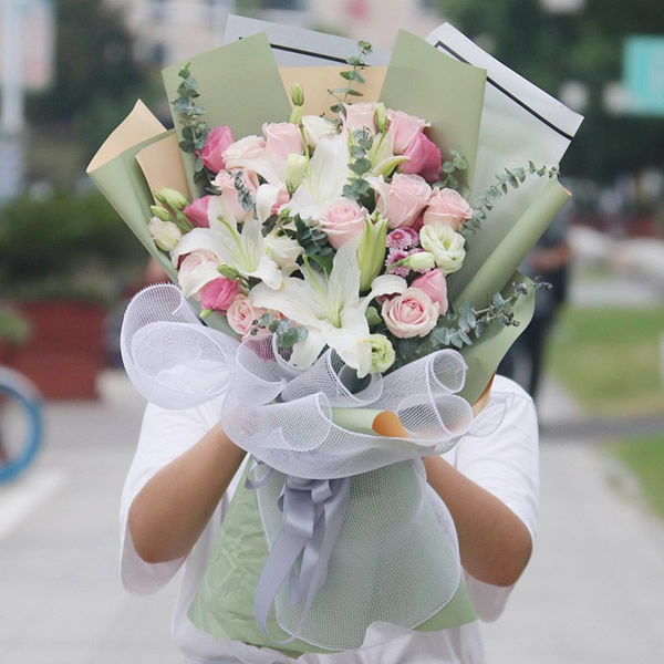 材料包裝: 白色多頭百合2只,11朵粉玫瑰,9朵白色洋桔梗,6朵粉色洋桔梗,小菊,綠葉尤加麗葉間插,淡綠色包裝,網紗襯托,花結,