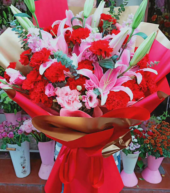 商品簡介:4支多頭百合,29朵康乃馨,5支粉色康乃馨,配草若干,高檔包裝。