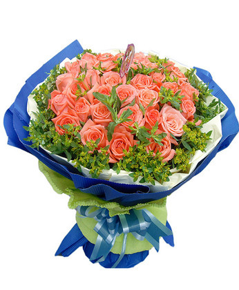 商品簡介:粉玫瑰33枝 葉上黃金 /或用幸福草 商品包裝:里層淺色卷邊紙,外層藍色卷邊紙包圓形