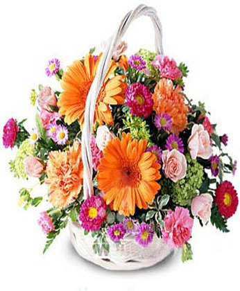 商品簡介:粉玫瑰5枝 扶郎6枝 各色康乃馨20枝 綠葉 勿忘我 商品包裝:精美小提籃