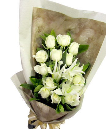 商品簡介:白玫瑰12枝 白色多頭百合1枝 梔子葉 商品包裝:咖啡色及淺色皺紋紙單面包裝