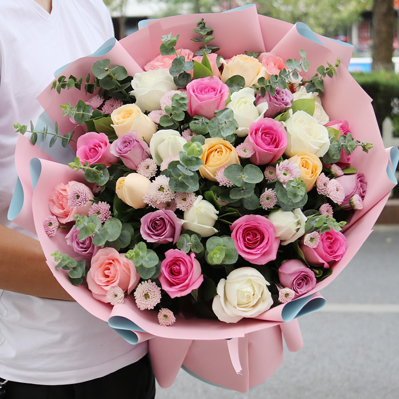 商品簡介:9朵紫玫瑰,9朵粉玫瑰,9朵香檳玫瑰,9朵白玫瑰,綠葉點綴,小菊間插,粉色高檔包裝.