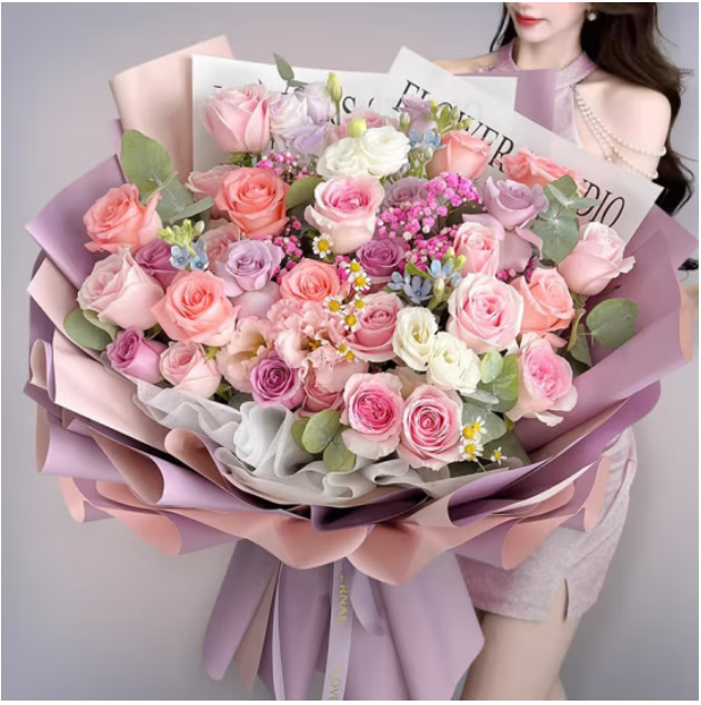 商品簡介:11朵粉玫瑰11朵紫玫瑰11朵戴安娜玫瑰花束,10只白桔梗,粉色滿天星,小菊,尤加麗葉,三層白紫粉高檔包裝。