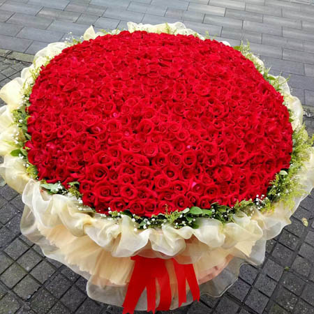 材料包裝: 紅玫瑰999支,滿天星,黃鶯,綠葉搭配,黃色包裝紙包裝,紗網(wǎng)外圍,紅色絲帶扎束