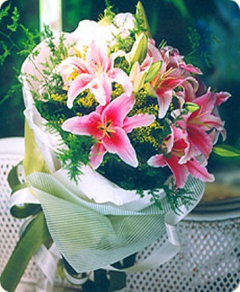 商品簡介:粉色多頭百合5枝 黃鶯 綠葉 商品包裝:內襯棉紙,皺紋紙圓形包裝