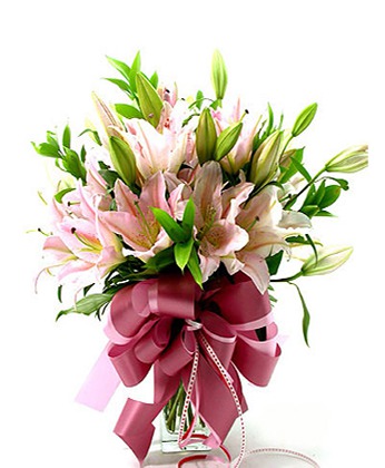 商品簡介:粉色多頭百合9枝 黃鶯 綠葉 商品包裝:花瓶(因地而異)