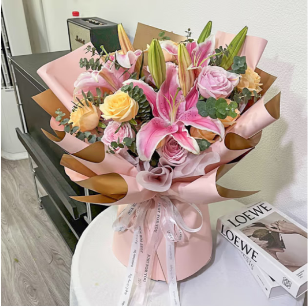 商品簡介:粉玫瑰6朵,香檳玫瑰6朵,2只多頭百合,綠葉點綴,粉色金色雙色高檔包裝。