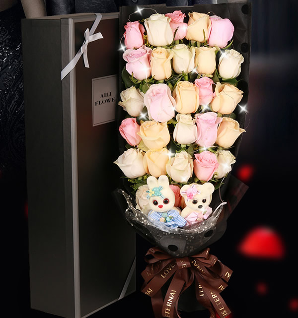 材料包裝: 粉玫瑰11枝,香檳11朵,白玫瑰11朵,燈帶一個,小熊2個,禮盒包裝.
