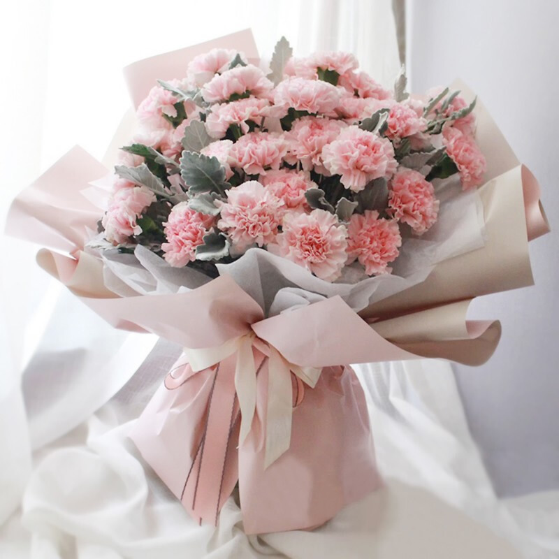 商品簡介:33朵櫻花粉康乃馨,銀葉菊間插豐滿。包裝:至少8張粉色牛皮紙,至少6張內(nèi)襯白色霧面紙,粉色絲帶束扎。