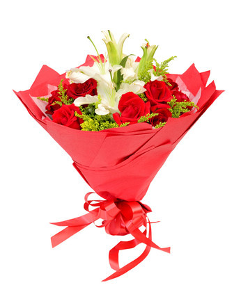 商品簡介:紅玫瑰11枝 白色多頭百合2枝 商品包裝:內(nèi)襯棉紙,多層紅色皺紋紙包裝,紅色絲帶束扎