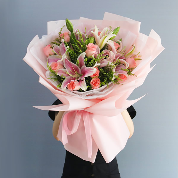 材料包裝: 粉玫瑰11枝,4只粉色多頭百合,黃英點(diǎn)綴,粉色包裝.
