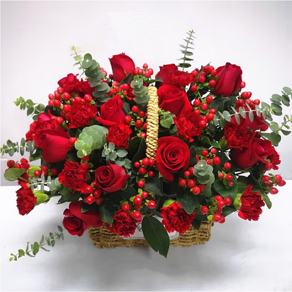 材料包裝: 紅玫瑰19枝,19朵紅康,紅豆,綠葉,手提花籃。