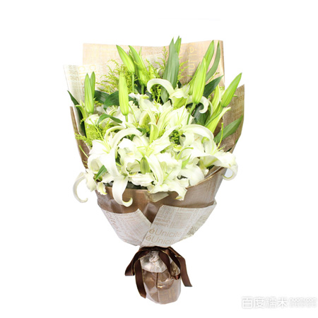 商品簡介:白色多頭百合6枝 黃鶯 綠葉 商品包裝:英文報紙扇形包裝