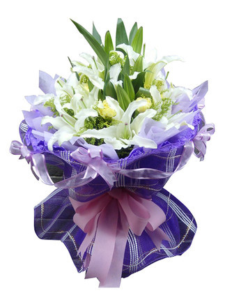 商品簡介:白色多頭百合9枝 黃色康乃馨6枝 綠葉、黃英間插 商品包裝:紫色綿紙內(nèi)襯,紫色卷邊紙圓形精美包裝,外圍一層紫色網(wǎng)紗、一圈紫色絲帶,粉色絲帶結(jié)束扎