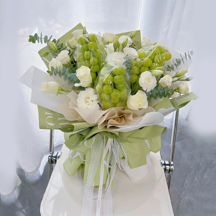 材料包裝: 材料3串陽光玫瑰青提,9朵白玫瑰,4支白色洋桔梗,適量尤加利葉裝飾包裝香檳色手揉紙+白色霧面紙+綠色帶英文硬紙包裝,白色蕾絲帶+白色細英文緞帶束扎