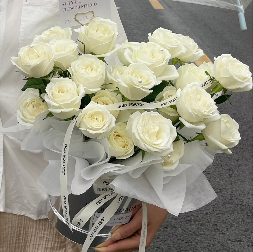 材料包裝: 白玫瑰19枝,部分花朵中間插仿珍珠裝飾,抱抱桶