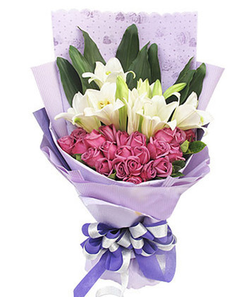 材料包裝: 白色多頭百合3枝 紫玫瑰22枝 巴西葉 梔子葉 商品包裝:紫色皺紋紙多層港式包裝