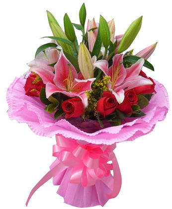商品簡(jiǎn)介:紅玫瑰10枝 粉色多頭百合2枝 黃鶯 滿天星 商品包裝:粉色卷邊紙包圓形