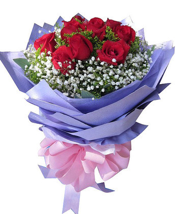 商品簡介:紅玫瑰9枝 滿天星 黃鶯 商品包裝:紫色皺紋紙包圓形