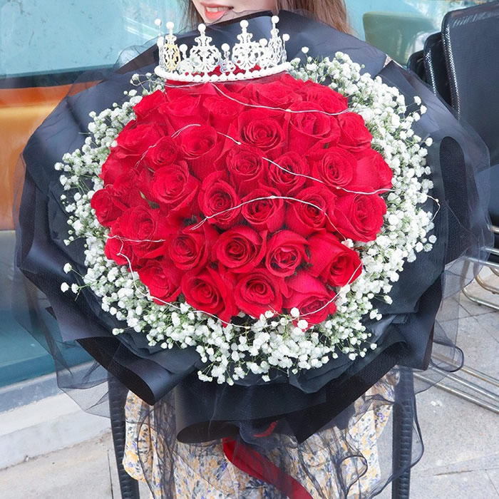 材料包裝: 紅玫瑰33枝,滿天星圍邊,燈帶,皇冠,黑色包裝。
