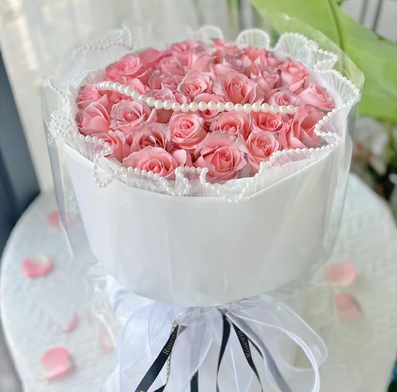 商品簡介:33朵粉玫瑰,白色帶珍珠軟網紗+白色硬紙+透明玻璃紙圓形包裝,白色蕾絲帶+黑色帶英文細緞帶束扎。