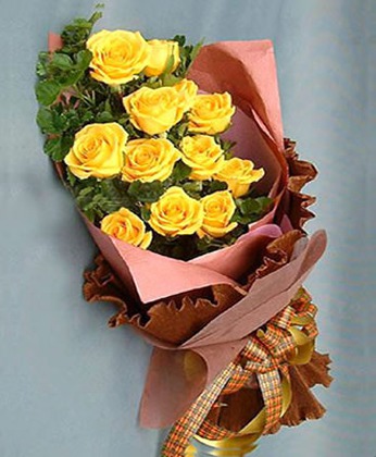 商品簡介:黃玫瑰11枝 綠葉 黃鶯 商品包裝:皺紋紙單面包裝