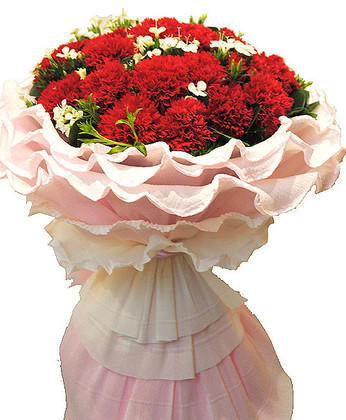 商品簡介:紅色康乃馨24枝 滿天星 黃鶯 商品包裝:粉色卷邊紙圓形包裝