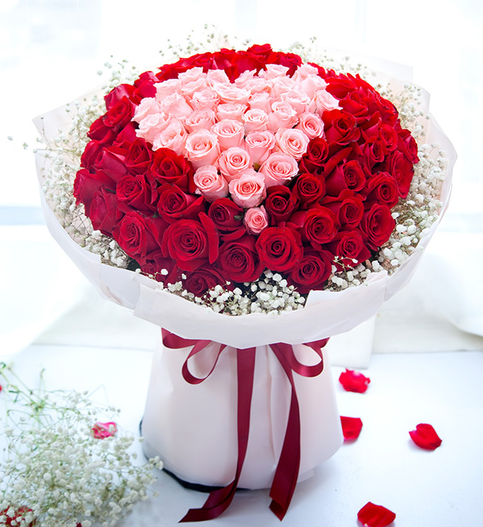 材料包裝: 材料99朵玫瑰(紅玫瑰、戴安娜粉玫瑰),中間粉玫瑰為心形造型。外圍搭配適量白色滿天星裝飾。包裝白色霧面紙+粉色霧面紙圓形包裝,酒紅色緞帶蝴蝶結束扎。
