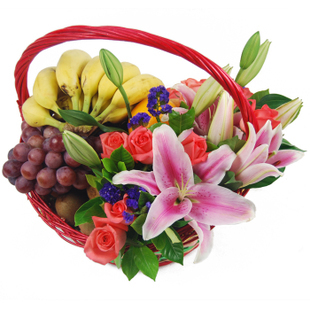 商品簡介:3支粉香水百合+12支粉玫瑰+香蕉+橙子+提子+奇異果;其中左面放鮮花,右面放水果