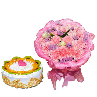 材料包裝: 花材:21枝粉色康乃馨,搭配勿忘我 包裝:內粉色卷邊紙,外粉色紗網圓形包裝,搭配粉色蝴蝶結 蛋糕:10寸水果蛋糕 (時令水果) 【蛋糕上的水果材料,會隨季節的變化而有所改變】