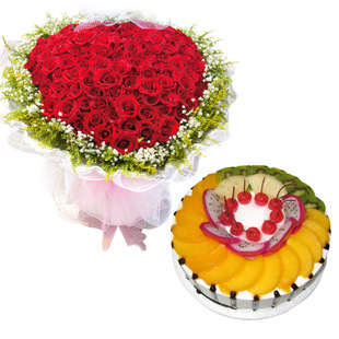 材料包裝: 花材:99枝紅玫瑰(心型),外圍滿天星、黃鶯 包裝:內(nèi)粉色卷邊紙,外白色紗網(wǎng)圓形包裝,搭配粉色蝴蝶結(jié) 蛋糕:8寸水果蛋糕