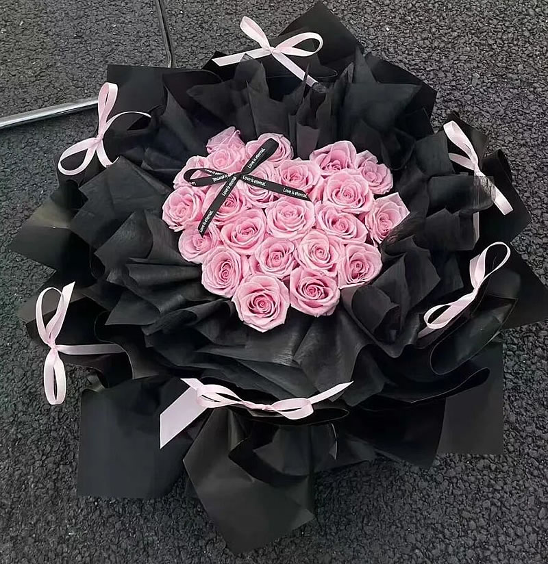 材料包裝: 19朵粉玫瑰,心型豪華包裝,7個小花結點綴。4層高檔黑色包裝。