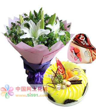 材料包裝: 白色多頭百合5枝 葉上黃金或者黃鶯(配花) +8寸水果鮮奶蛋糕 外加德芙巧克力109克