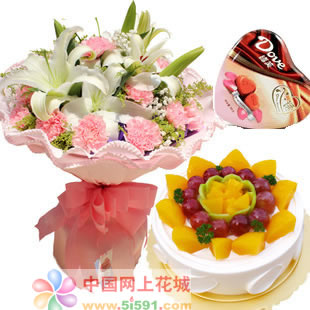 材料包裝: 11枝粉色康乃馨+3枝白色多頭香水百合,搭配黃鶯滿天星 8水果蛋糕;外加德芙巧克力109克