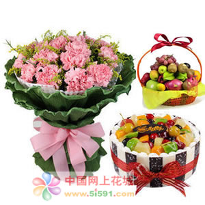 商品簡介:19朵康乃馨+8寸水果糕;果籃:蘋果,香梨,火龍果,提子,桔子,奇異果