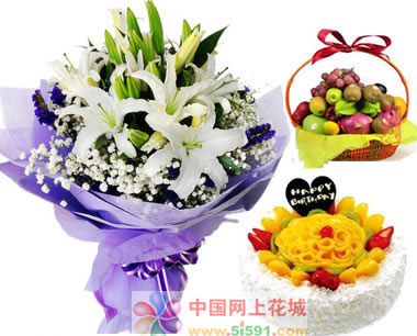 材料包裝: 5支百合+8寸奶油蛋糕 果籃:蘋果,香梨,火龍果,提子,桔子,奇異果