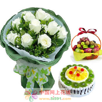 材料包裝: 9支白玫瑰 加巴西葉情人草搭配;10寸水果蛋糕(時令水果)果籃:蘋果,香梨,火龍果,提子,桔子,奇異果
