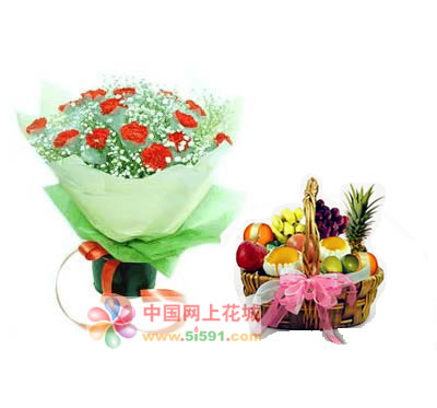 材料包裝: 12枝大紅色康乃馨;果籃:花束,菠蘿 蘋(píng)果 香蕉 橙子 彌候桃葡萄